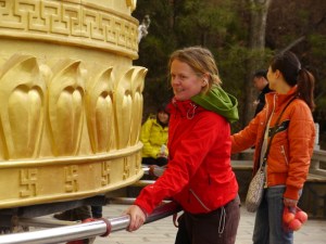 Our mission: to turn the massive prayer wheel. The wheel is so heavy it takes at least ten adults to budge it. If you can spin it a full three revolutions it’s good luck. Nine is great luck. Marieka, the little laowai that could, tried moving it by herself until she was blue in the face, hands, and feet. She didn’t succeed on her own, but she managed to inspire a group of Chinese tourists to gather around and spin it the full nine times.