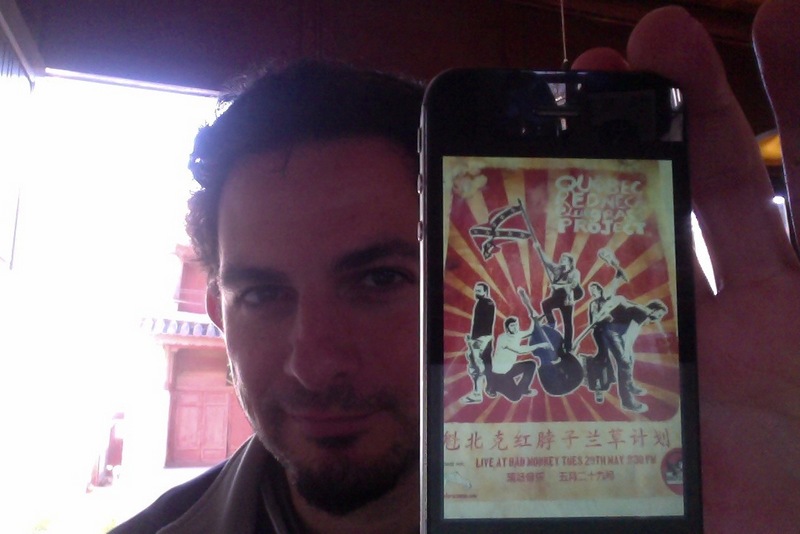 The manager introduced me to a Chinese-American man walking through—boyfriend or co-owner, I wasn’t sure, but his name was, of course, Steven. The cafe had wifi so I emailed my friend Chantale in Quebec. As I checked out of the Jade Emu this morning, I saw a flyer for a band called “Quebec Redneck Bluegrass Project.” Chantale and I had driven across the U.S. in 2006, inadvertently stopping for bluegrass music between Waffle Houses. At a Memphis club we even wandered into the front row of a women’s dance contest, in which Chantale stubbornly refused to participate. It’s an American thing, she insisted. Quebecois don’t do such things. Twenty minutes later, the MC asked the winner of the contest, a bespectacled, curly-haired mouse of a girl, where she was from. Sweaty and out-of-breath from annihilating a floor full of American women at their own game, the winner answered, “Montreal.” So I thought Chantale would appreciate a flyer of the “Quebec Redneck Bluegrass Project” even if it was from May. Sometimes, as you can tell, these flyers aren’t taken down right away. Or maybe the band’s playing this coming May and are just really on the ball. No, probably last May, because I have a vague recollection of meeting one of the band members at the Monkey. I had no way of transferring the iPhone photo to my laptop without the cord, so I took this photo of the phone with my laptop camera. And I share it with you because, due to the slightly out-of-focus image and the rear lighting of the cafe, I appear more even devilishly handsome than normal.